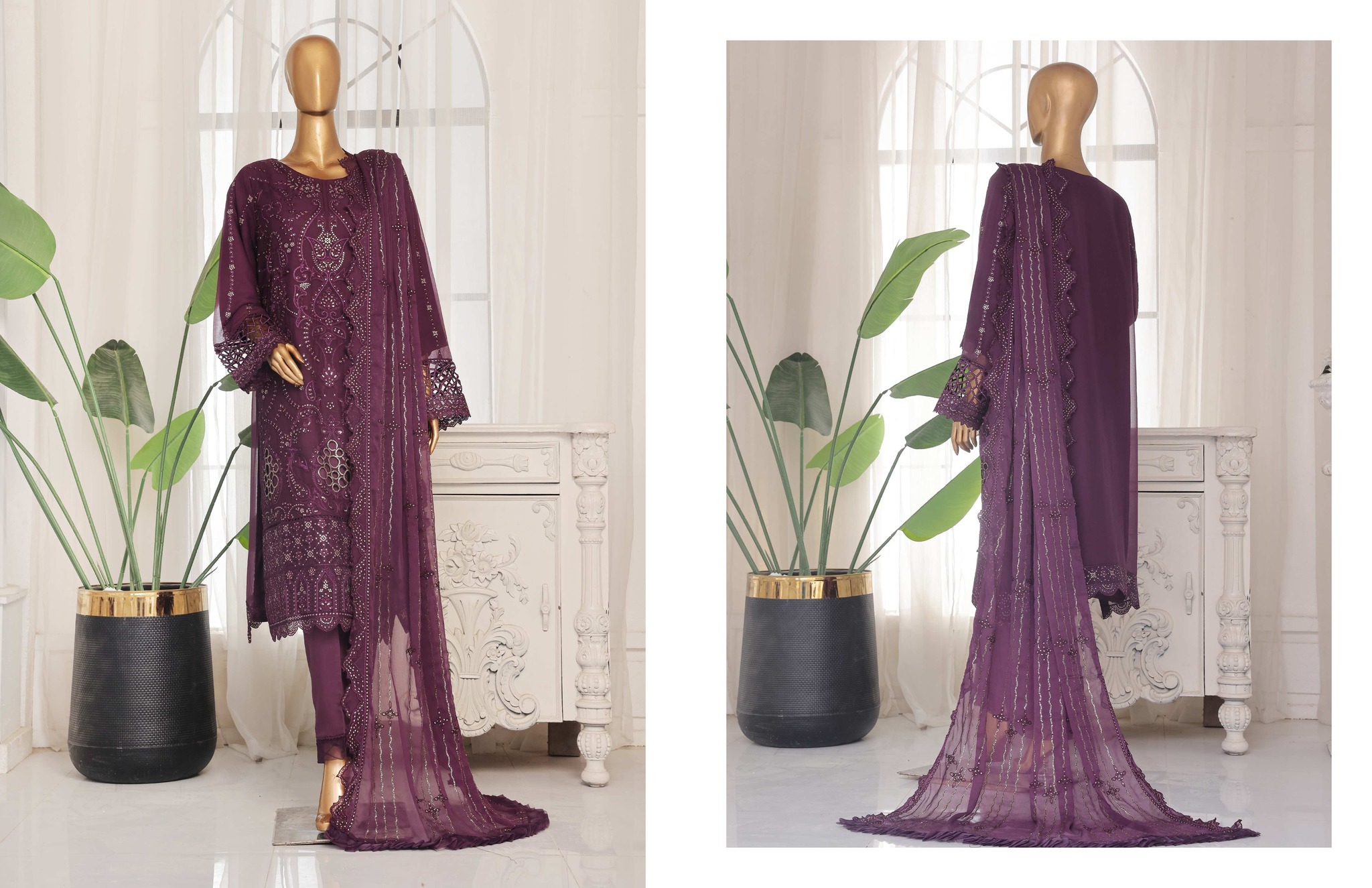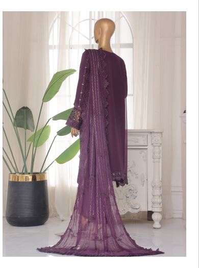 Make a bold and elegant statement with Bin Saeed Deep Purple Stitched Pakistani Three Piece, designed for women who love rich and royal colors for special occasions.